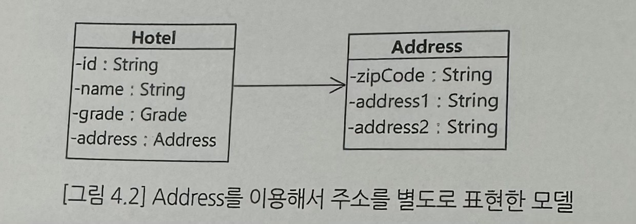 Hotel 클래스는 주소 자체를 의미하는 address 데이터를 갖고 있다. 그리고 Address 클래스는 zipcode, address1, address2를 데이터로 갖고 있어 따로 유추하지 않아도 주소가 우편번호, 주소1, 주소2로 구성된다는 것을 알 수 있다.