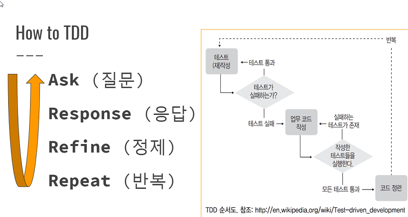 TDD 개발은 크게 질문 -> 응답 -> 정제 라는 세 단계가 반복적으로 이루어진다.