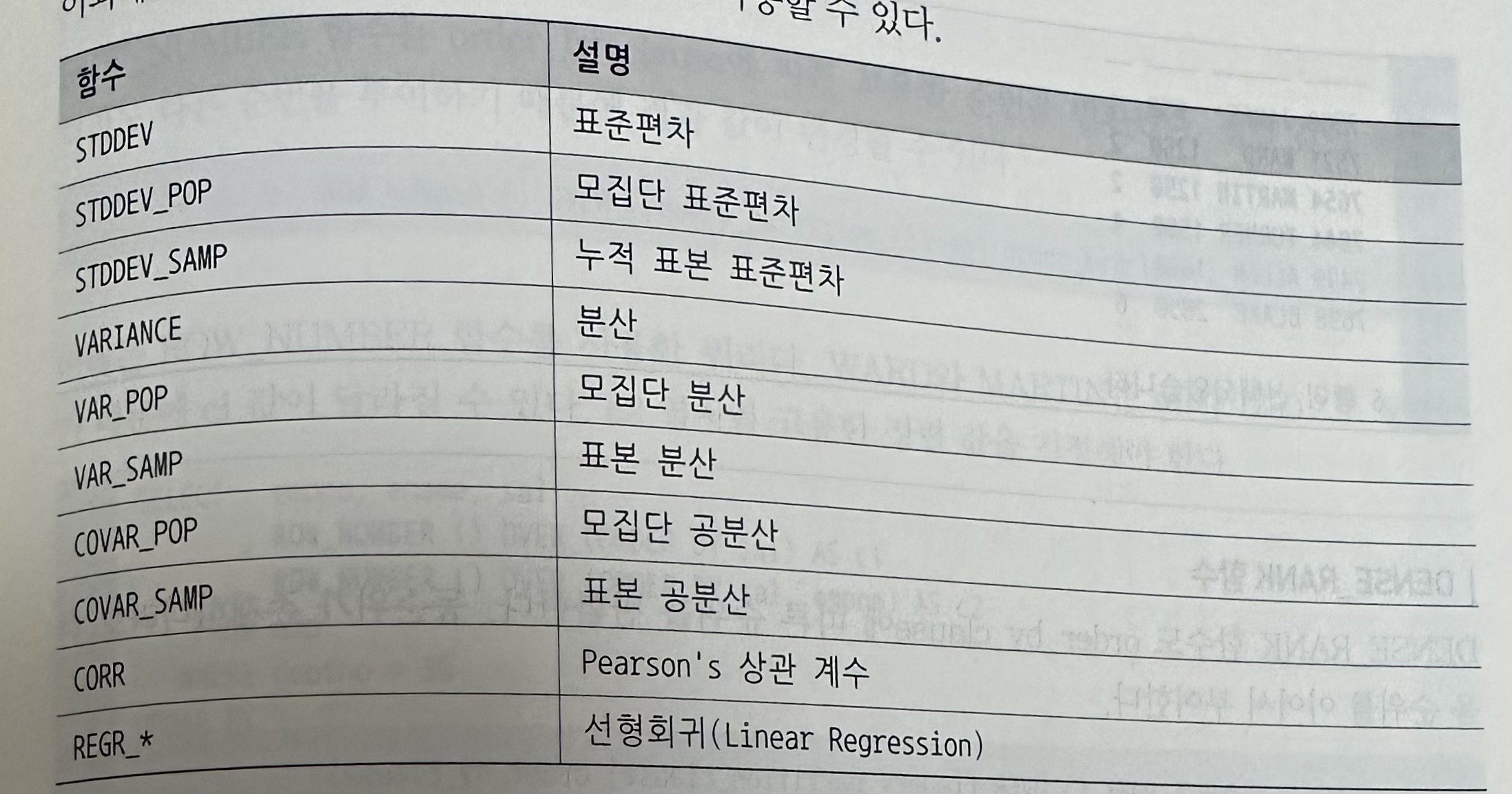 이외에도 다음의 통계 함수를 분석 함수로 사용할 수 있다.