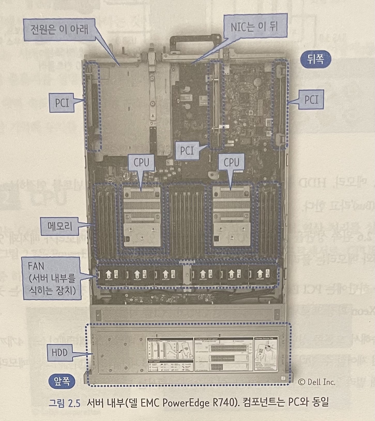 PCI Express 슬롯은 외부 장치를 연결하는 곳이다. BMC 컴포넌트는 서버의 H/W 상태를 감시하며 독립적으로 움직인다. 이렇게 서버의 구성을 보면 서버와 PC가 물리적으로는 구성이 같다는 것을 알 수 있다.