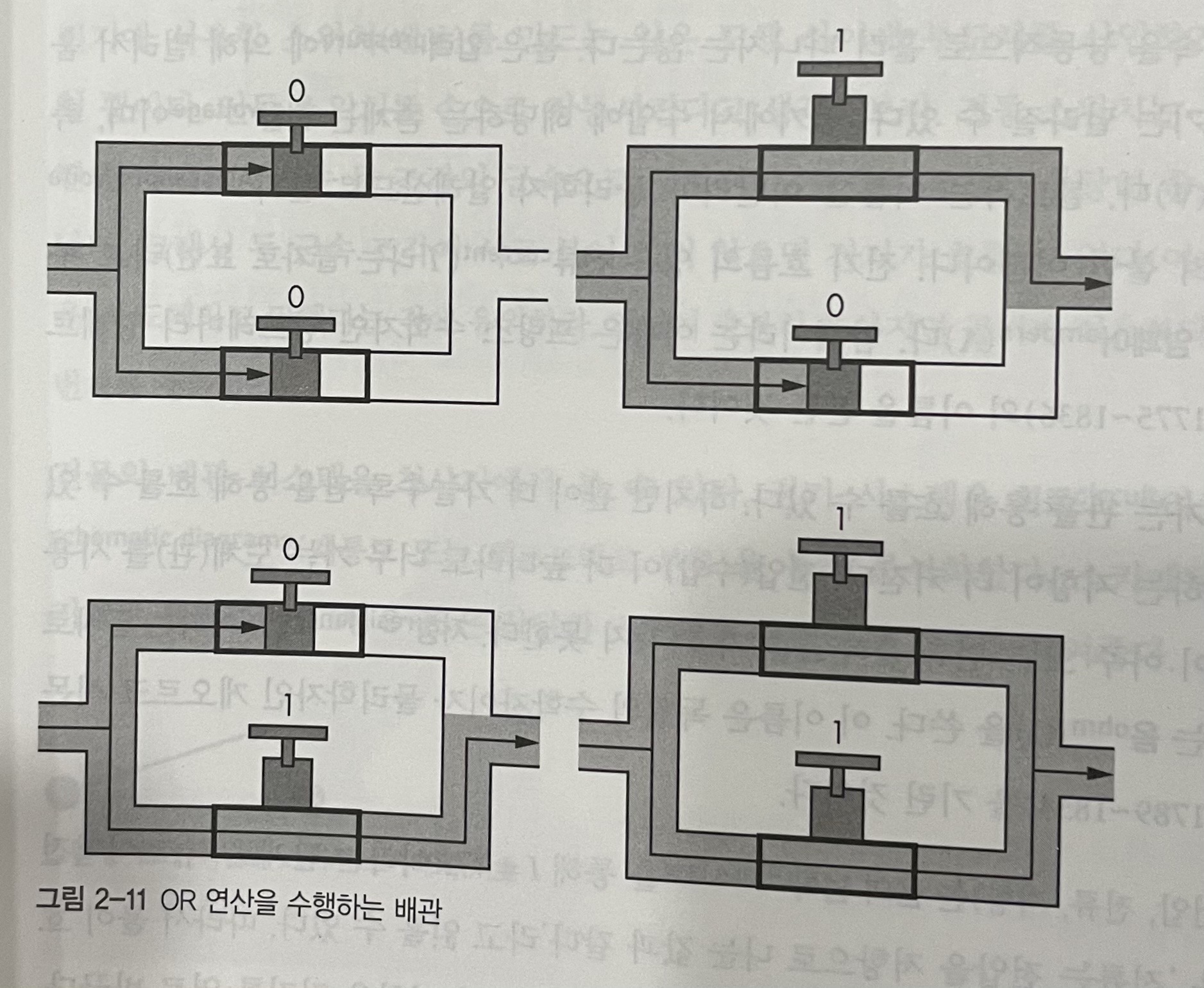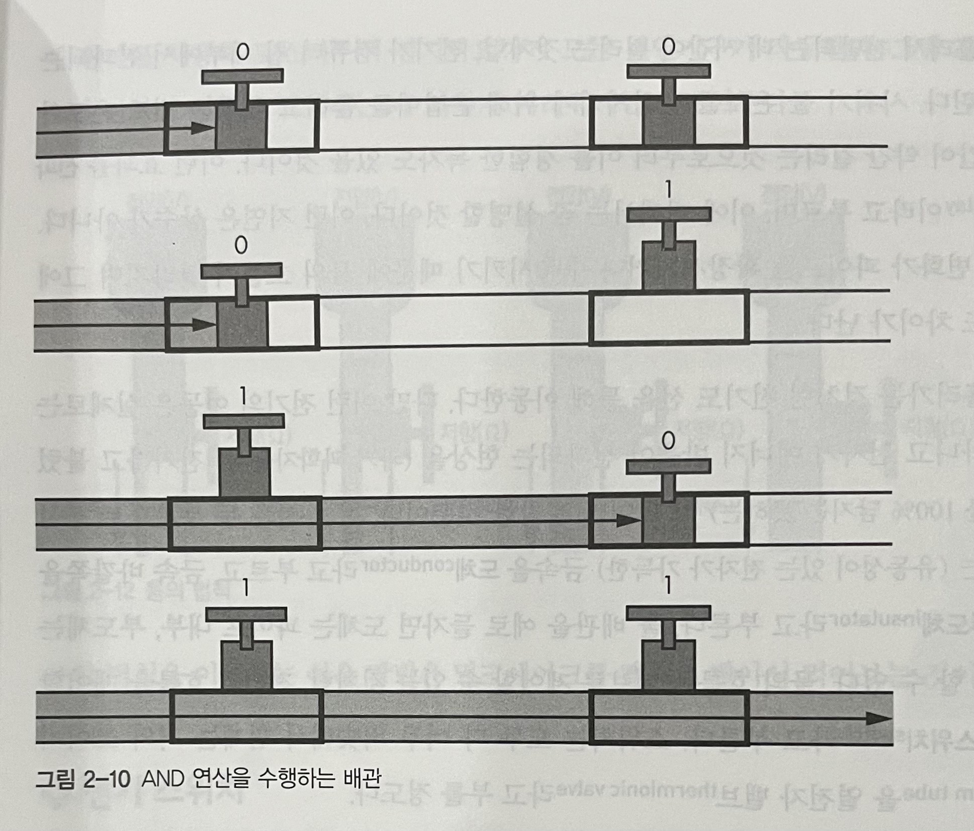 파이프를 사용하여 AND 연산을 수행하는 모습을 보면 두 벨브가 열려있을 경우에만 물이 흐른다. 이렇게 한 밸브의 출력이 다른 밸브의 입력에 연결될 경우 ‘직렬 연결’이라고 한다.