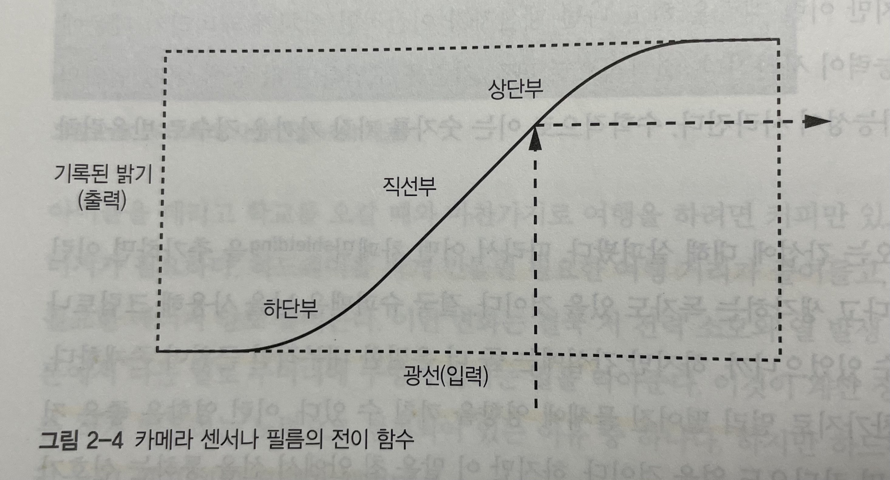 전이 함수란 수학시간에 배우는 함수와 같지만 실제 세계에서 벌어지는 현상을 표현한다. 디지털 카메라를 생각해보면 빛의 값이 다르면 전이 함수가 기록하는 빛의 값도 달라진다. 빛이 곡선의 상단부에 많이 닿으면 밝기 값이 서로 모이면서 이미지 노출이 과해진다. 반대로 빛의 곡선이 하단부에 많이 닿으면 이미지 노출이 부족해진다. 따라서 카메라의 경우 노출을 조절해서 빛이 직선부에 많이 닿게 만드는 것이다.