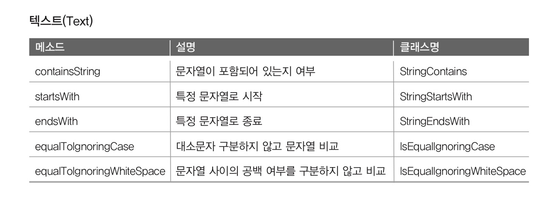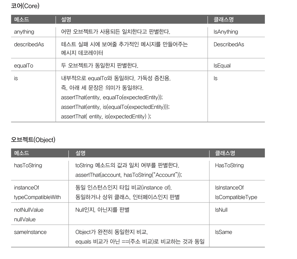 - org.hamcrest.core : 오브젝트나 값들에 대한 기본적인 Matcher