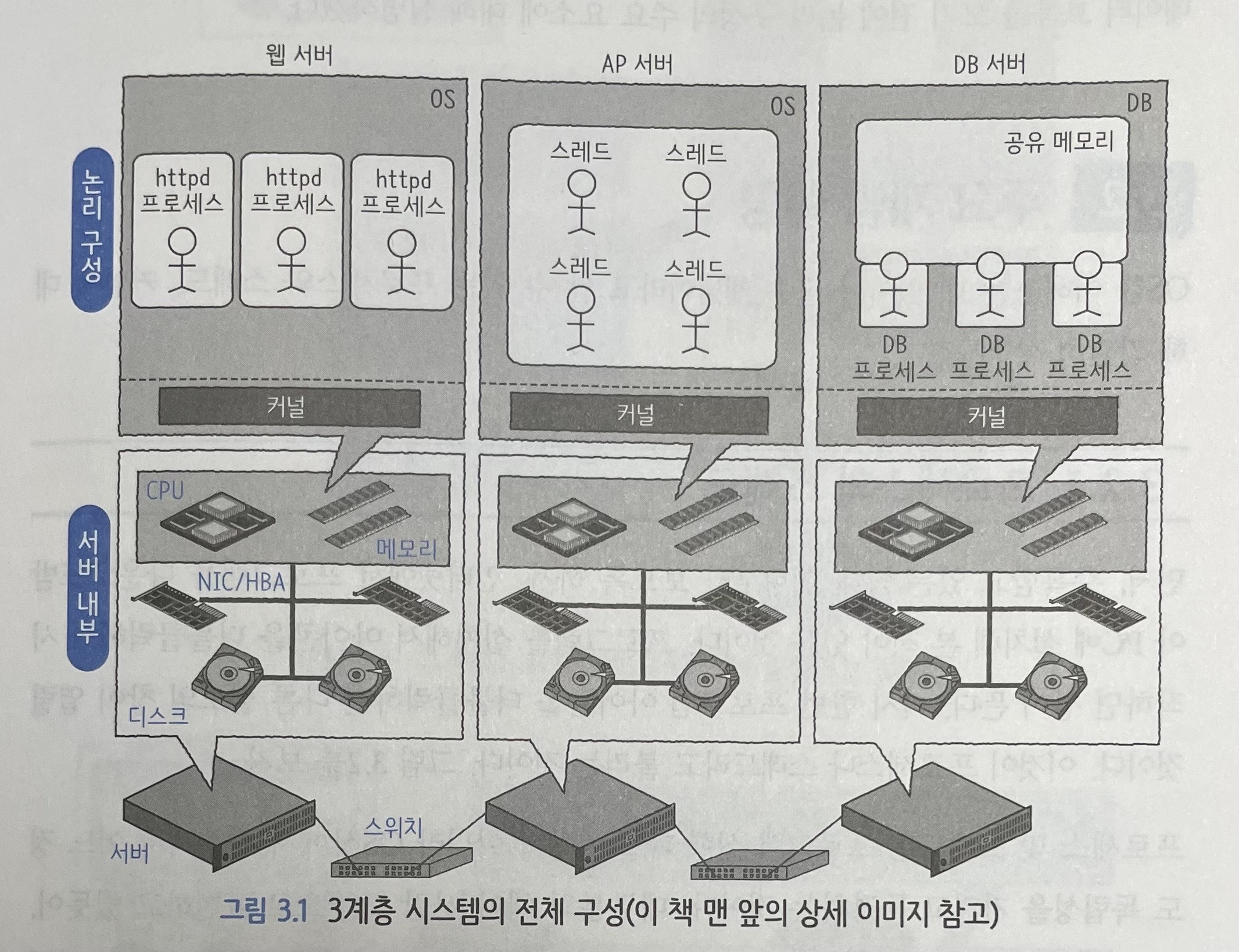 가장 아래에 서버가 배열되어 있고 서버끼리는 스위치를 경유해 연결되어 있다. 각각의 서버 안에는 CPU, 메모리, 디스크 등의 하드웨어 부품이 나열돼 있다. 그리고 그림에서 논리 구성에 해당하는 부분은 OS 영역을 보여주고 있다.
