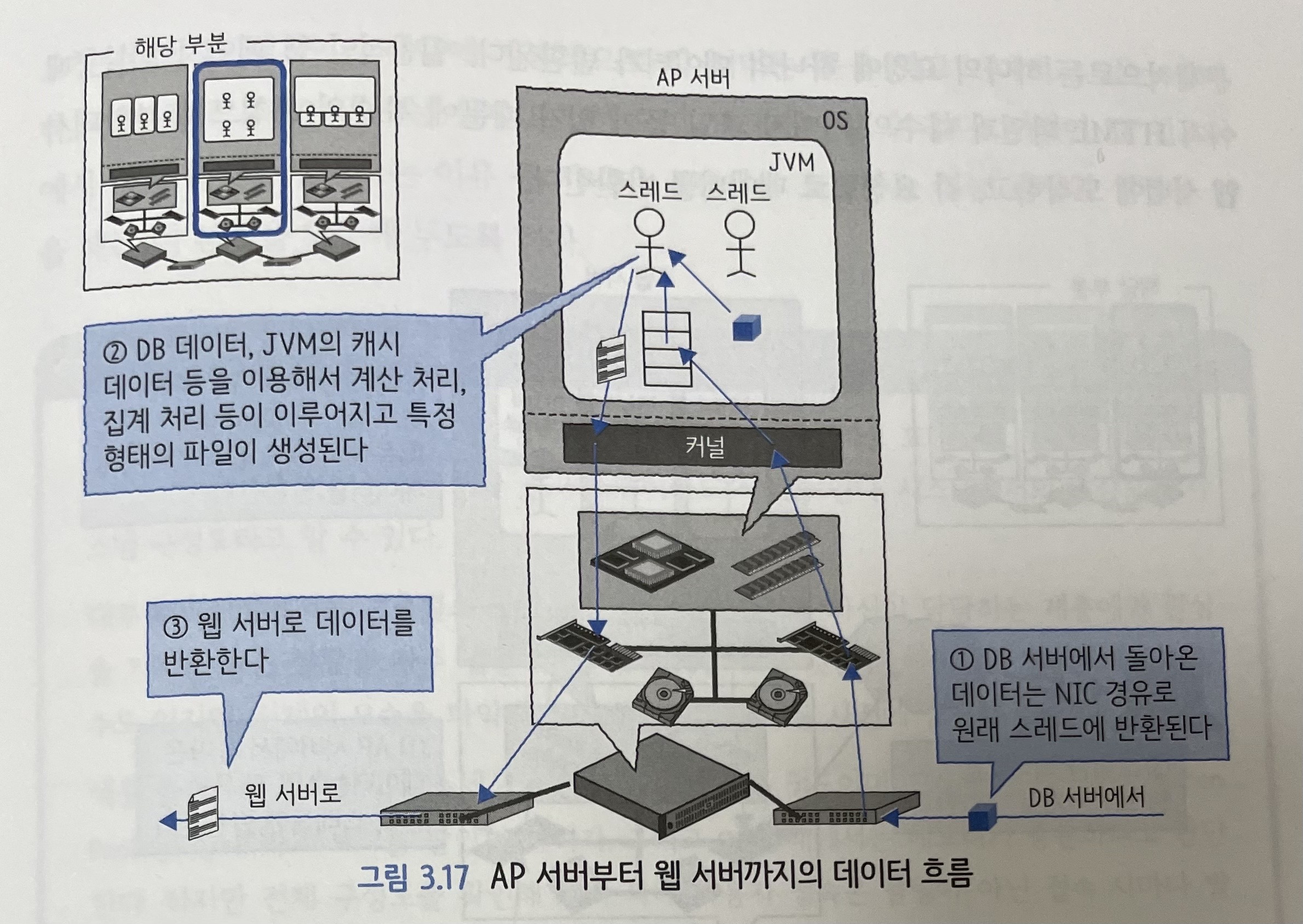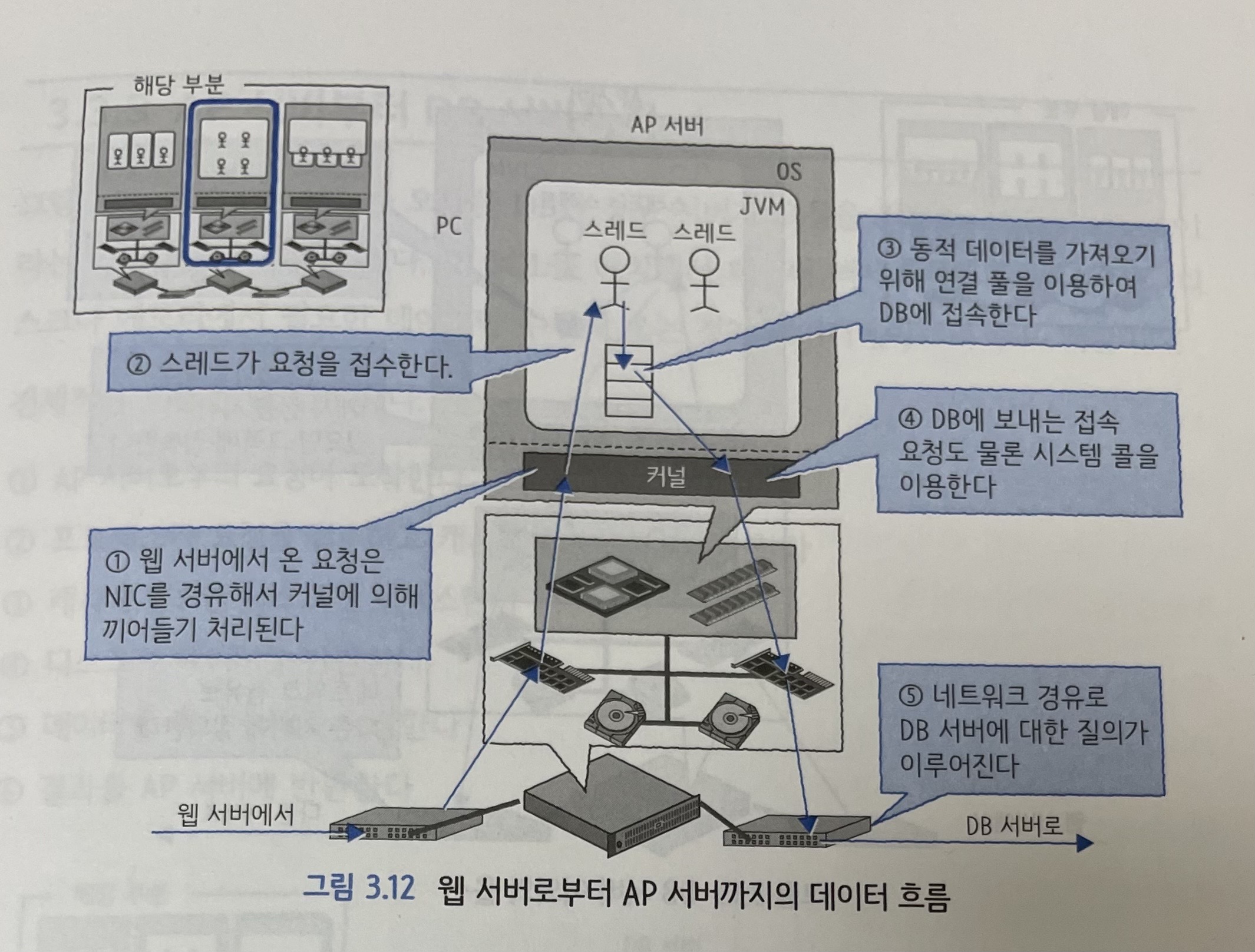 그림에서 웹 서버에 있는 막대 인간이 프로세스다. 그 주변을 감싸고 있는 하얀 영역이 프로세스의 메모리 공간을 나타낸다. AP 서버에서는 막대인간이 스레드이다. 프로세스는 전용 메모리 공간을 이용해 동작하지만 스레드는 다른 스레드와 메모리 공간을 공유하고 있는 운명 공동체다.