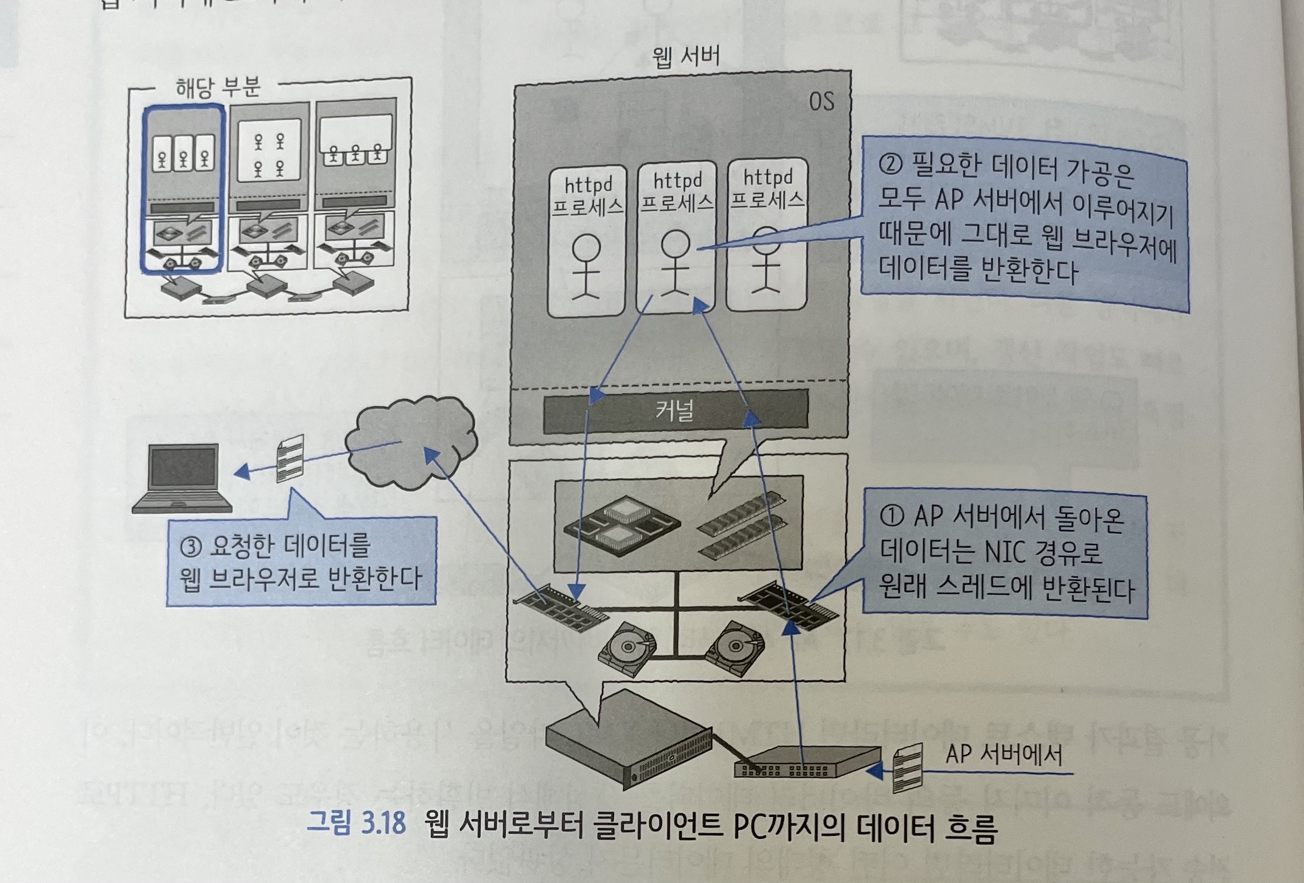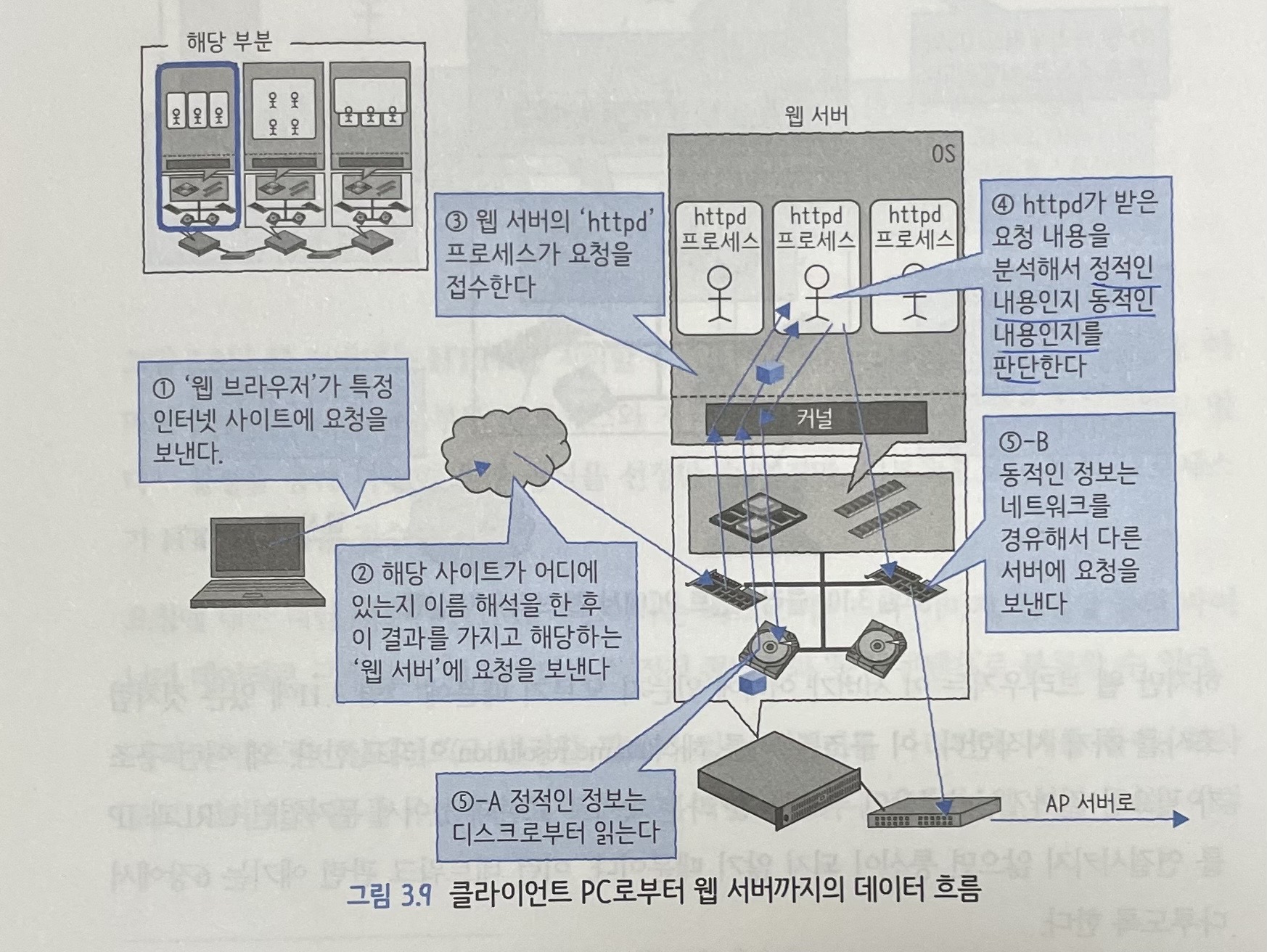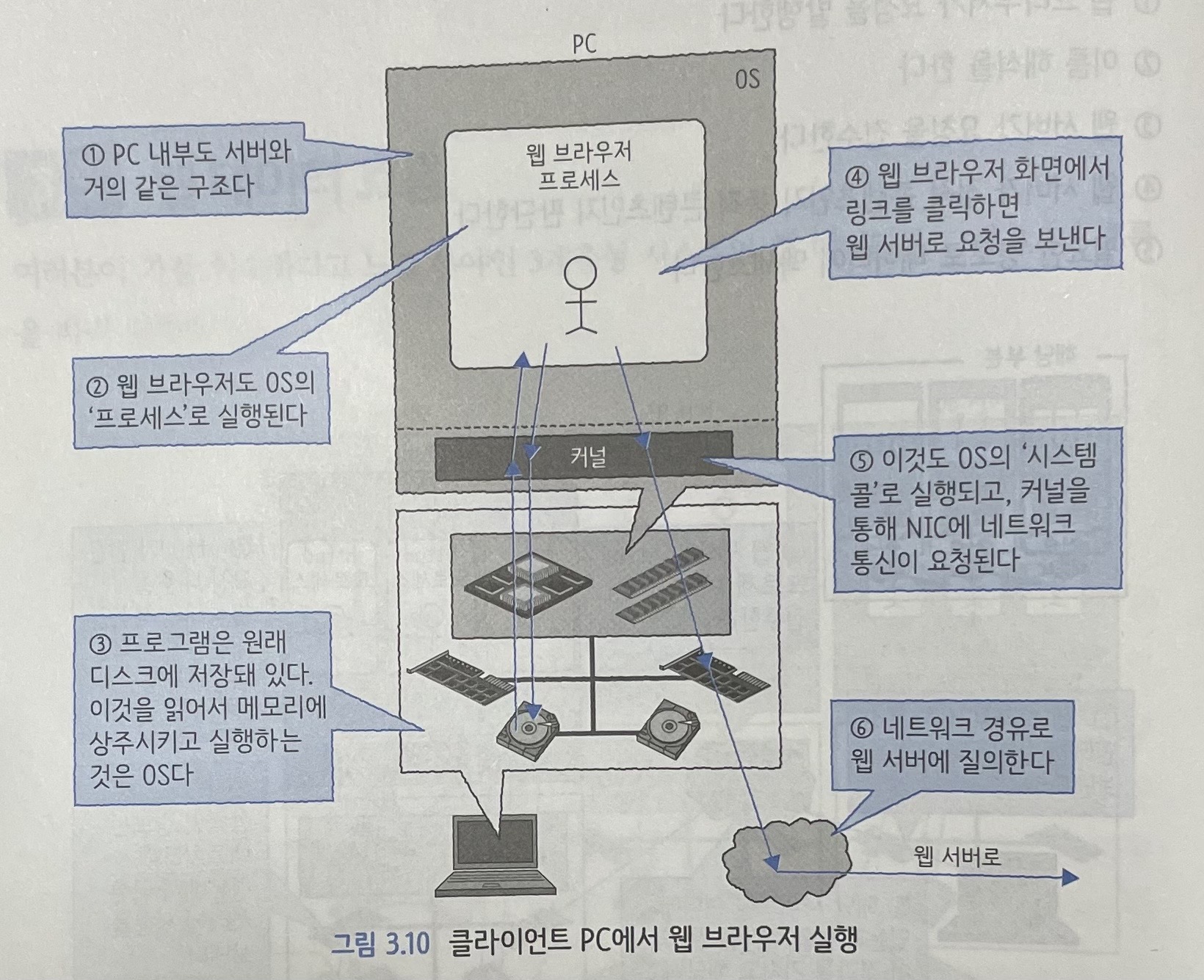 PC에서의 처리 흐름은 디스크에서 프로그램을 읽어 프로세스를 시작하고, 메모리 공간을 확보한다. 주소창에 ‘http://abcd.com’을 입력하면 이름의 해석이 이루어진 후에 웹 브라우저로 접속하게 된다. 이름의 해석이 필요한 이유는 인터넷상의 주소는 IP라는 숫자로 표현돼 있어서 문자열인 URL과 IP를 연결시키지 않으면 통신이 되지 않기 때문이다.