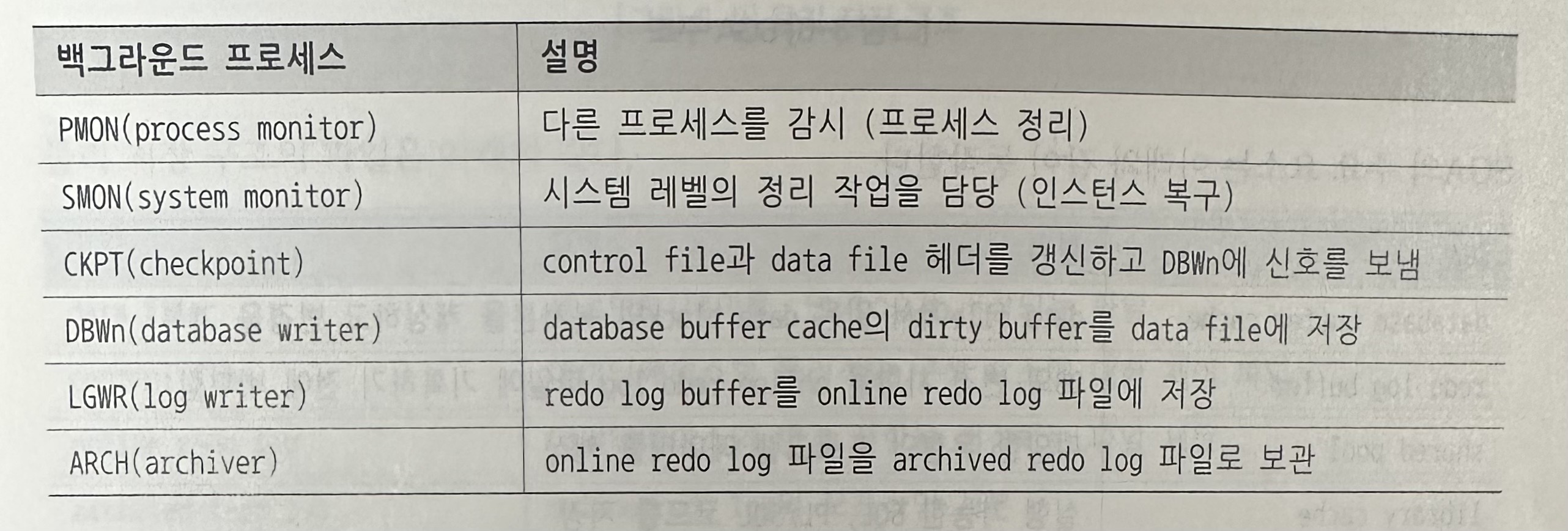 오라클 데이터베이스의 프로세스는 백그라운드 프로세스와 서버 프로세스로 구성된다. 백그라운드 프로세스는 데이터베이스 운영에 필요한 백그라운드 작업을 수행한다. 주요 백그라운드 프로세스는 아래와 같이 동작한다.