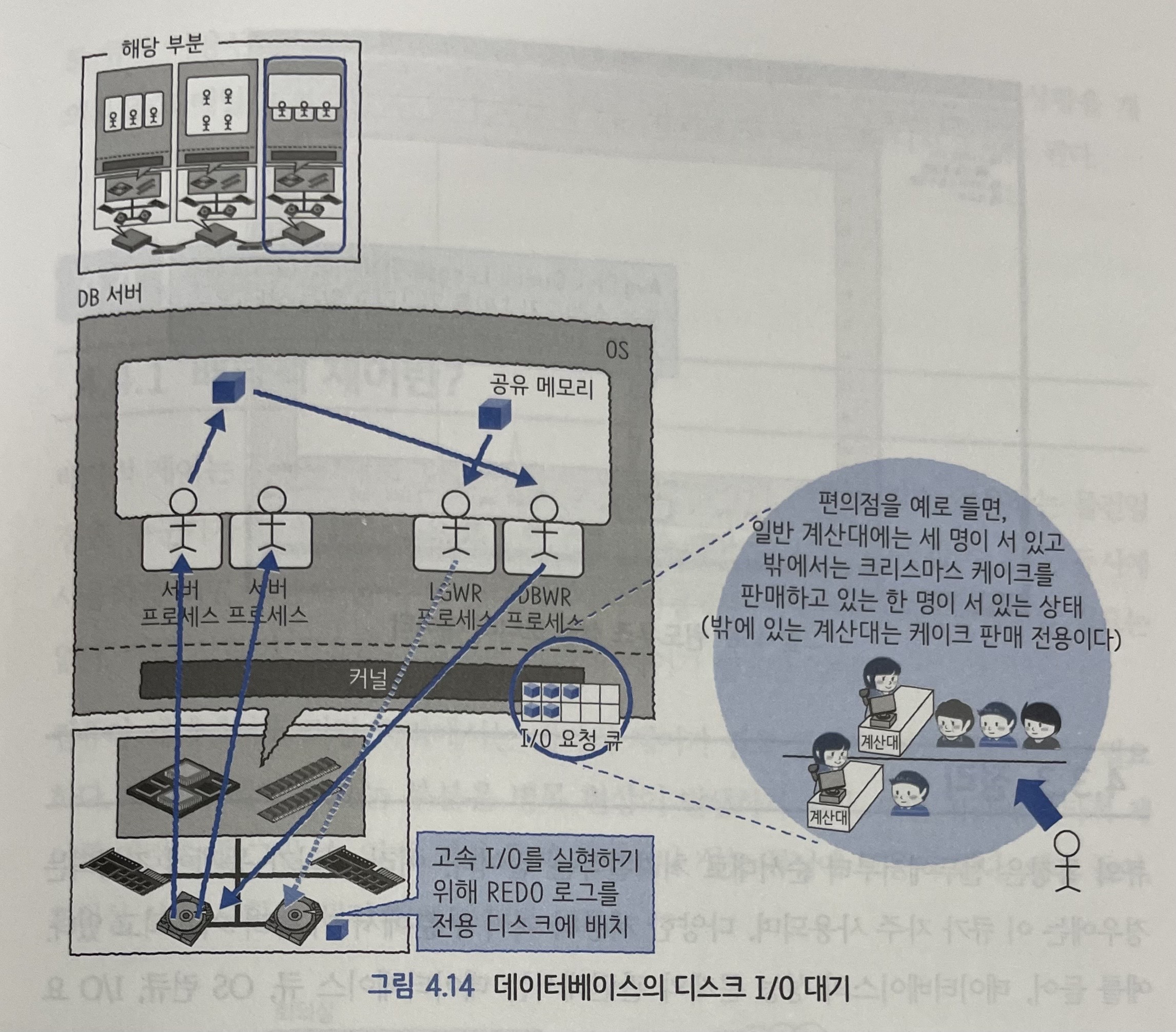 오라클 DB의 동작을 보면 두 개의 서버 프로세스와 DBWR 프로세스는 왼쪽 HDD에 I/O를 실시하고 있고, LGWR 프로세스는 오른쪽 HDD에 I/O를 실시하고 있다. 전자는 왼쪽 HDD 데이터에 액세스하고, 후자는 오른쪽 HDD에 액세스 한다. HDD는 데이터가 기록돼 있는 특정 위치에 액세스해야 하기 때문에 CPU처럼 비어 있다는 이유로 다른 것을 사용할 수 없다. 이 점이 HDD와 CPU의 차이점이다.