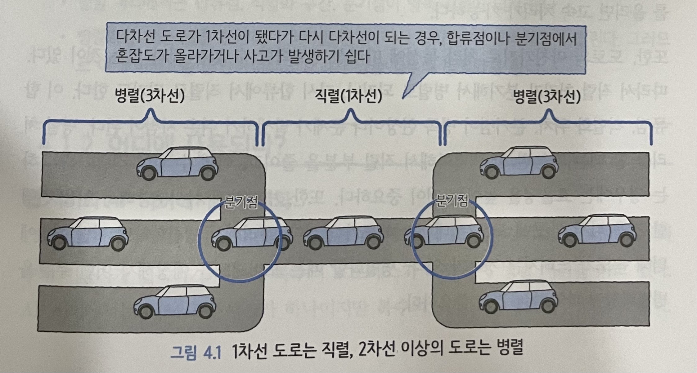 위 그림에서 3차선 도로가 도중에 합류해서 1차선이 되고, 다시 3차선으로 분기하고 있다. 합류점부터 시작되는 1차산 구간은 혼잡해지기 쉽고 사고가 발생하기 쉽다. 1차선 구간은 전체 흐름을 느리게 만드는 병목 지점 이 된다. 이러한 혼잡상황을 해결하는 방법으로는 1차선 구간을 3차선으로 만드는 것이다. 이것은 컴퓨터 세계에서도 마찬가지이다.