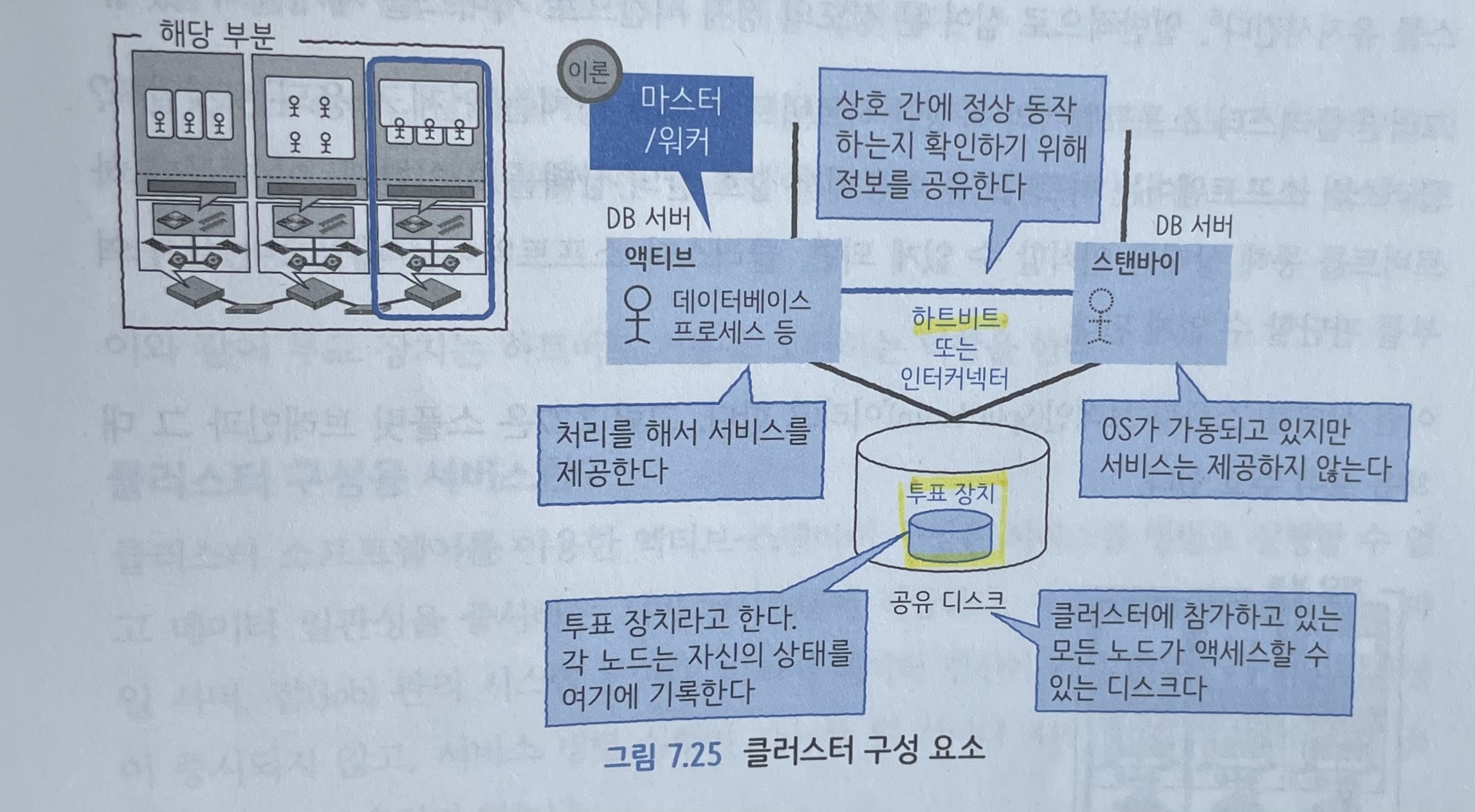 클러스터 구성은 HA(고가용성) 구성이라고 부르고 클러스터의 노드나 서비스 관계는 마스터-워커 개념을 기반으로 하고 있다. 서버가 정상 동작하는지 확인하기 위한 구조로 하트비트, 투표 장치 같은 기능이 존재한다.