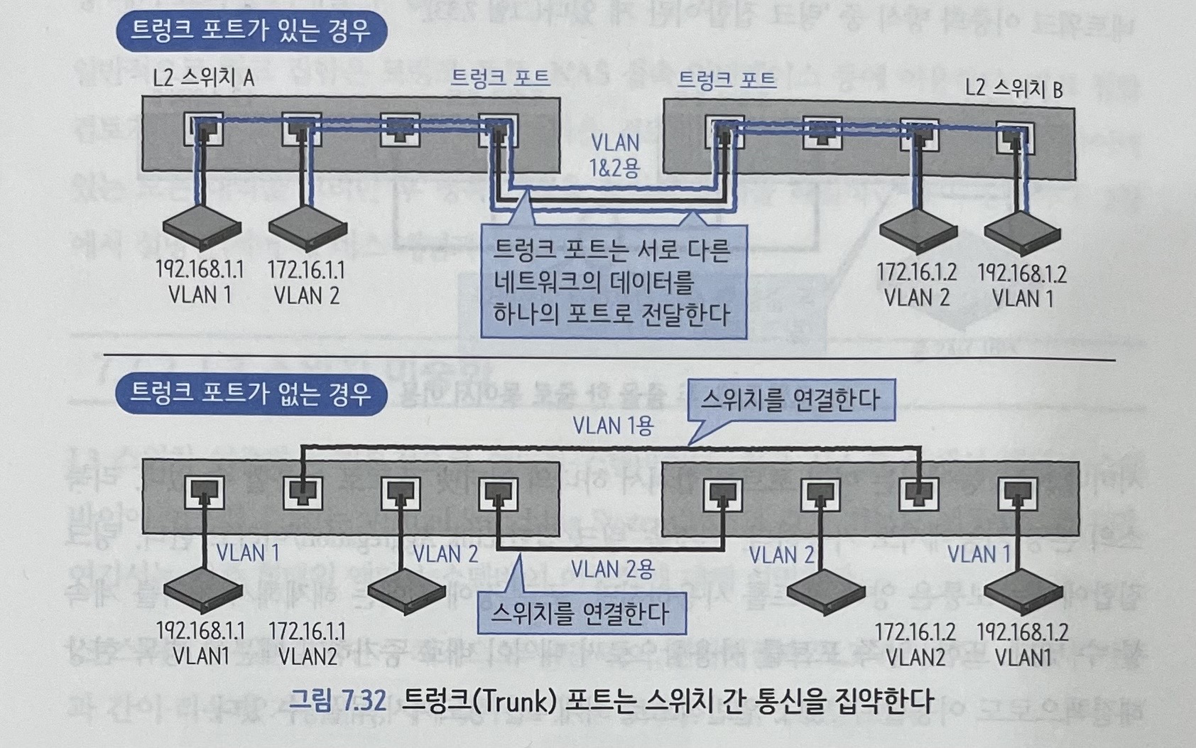 위 그림처럼 트렁크 포트를 사용하면 포트를 복수의 VLAN에 소속시킬 수 있다.