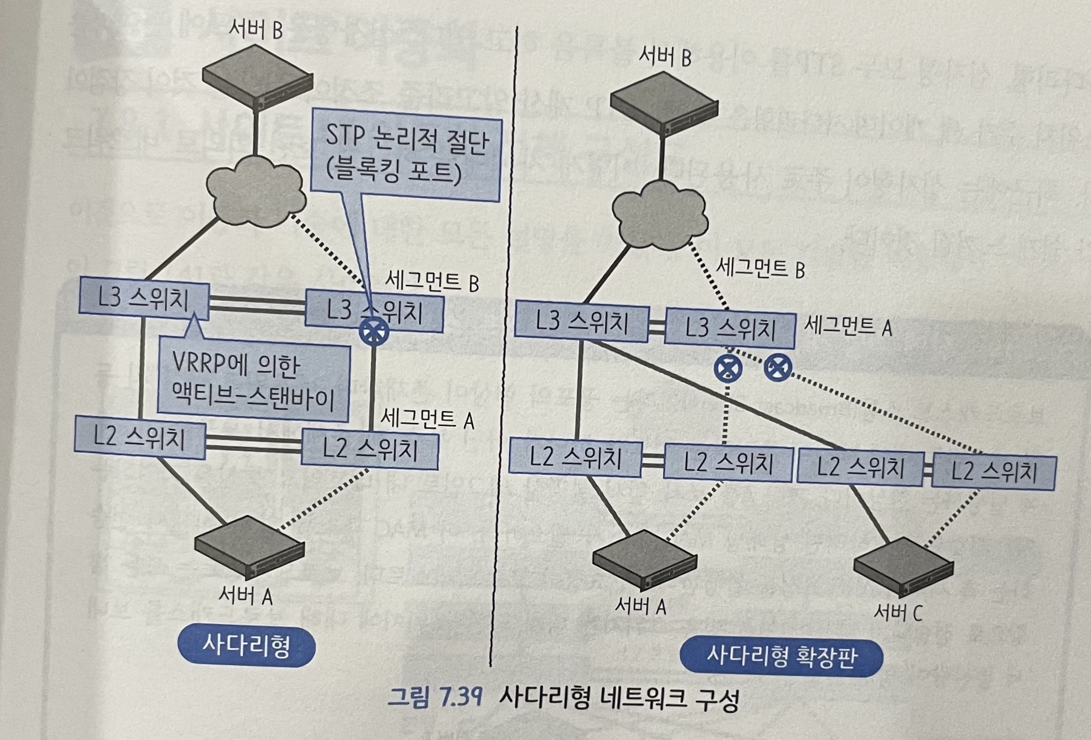 네트워크에서 중요한 것은 특정 시점에 출발지부터 목적지까지 경로가 하나가 되는 것이다. 경로가 다수 존재하면 안정성 측면에서 좋지 않다. 이것을 해결하기 위한 수단으로 Spanning Tree Protocol (STP)를 이용할 수 있다. STP를 이용하면 논리적으로 포트를 절단할 수 있다. 장애가 밣생하면 STP에 의해 재계산이 이루어지고 논리적으로 절단돼 있는 포트를 개통해서 통신이 가능해진다.