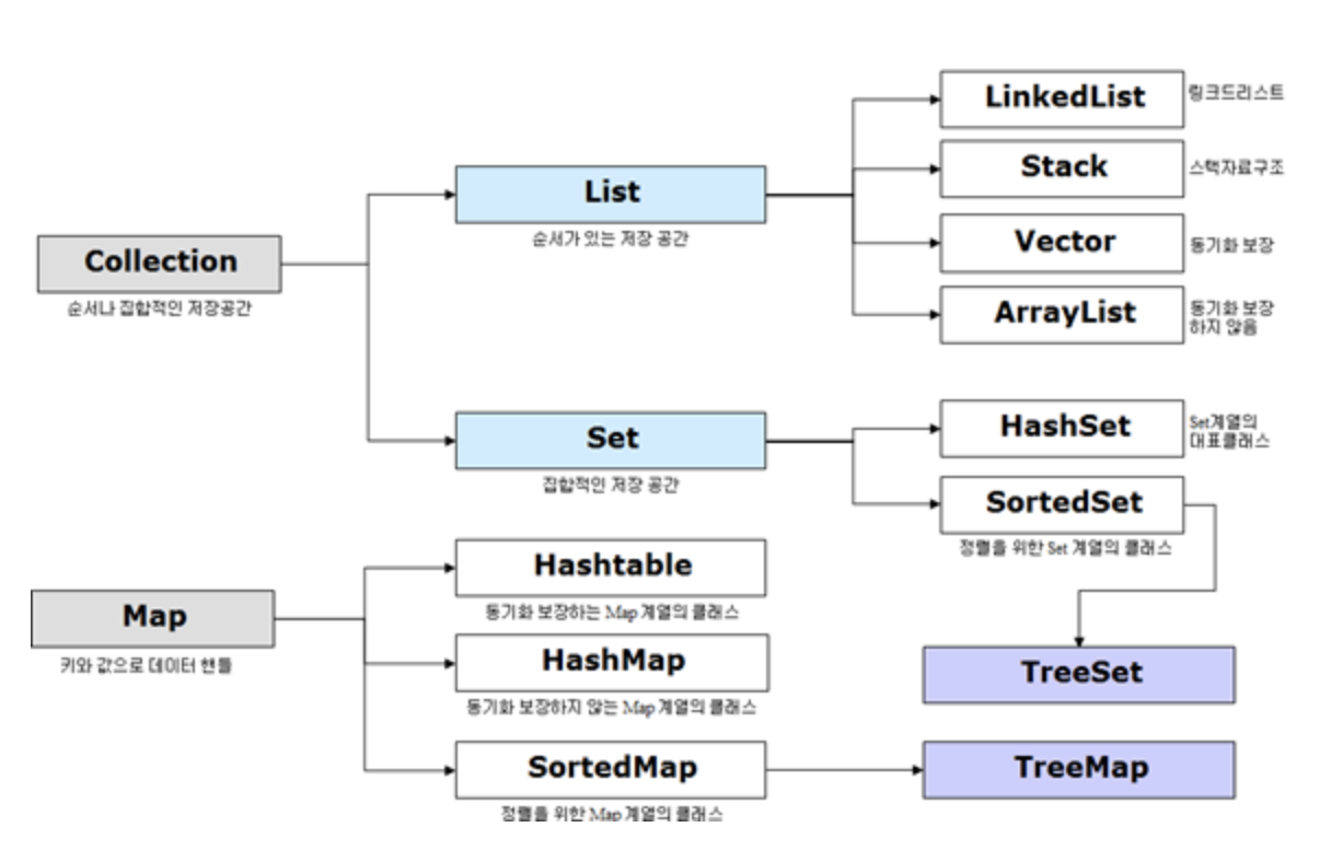 - Map : 키와 값의 쌍으로 이루어진 데이터의 집합으로 순서는 유지되지 않으며 키는 중복을 허용하지 않고, 값은 중복을 허용한다.