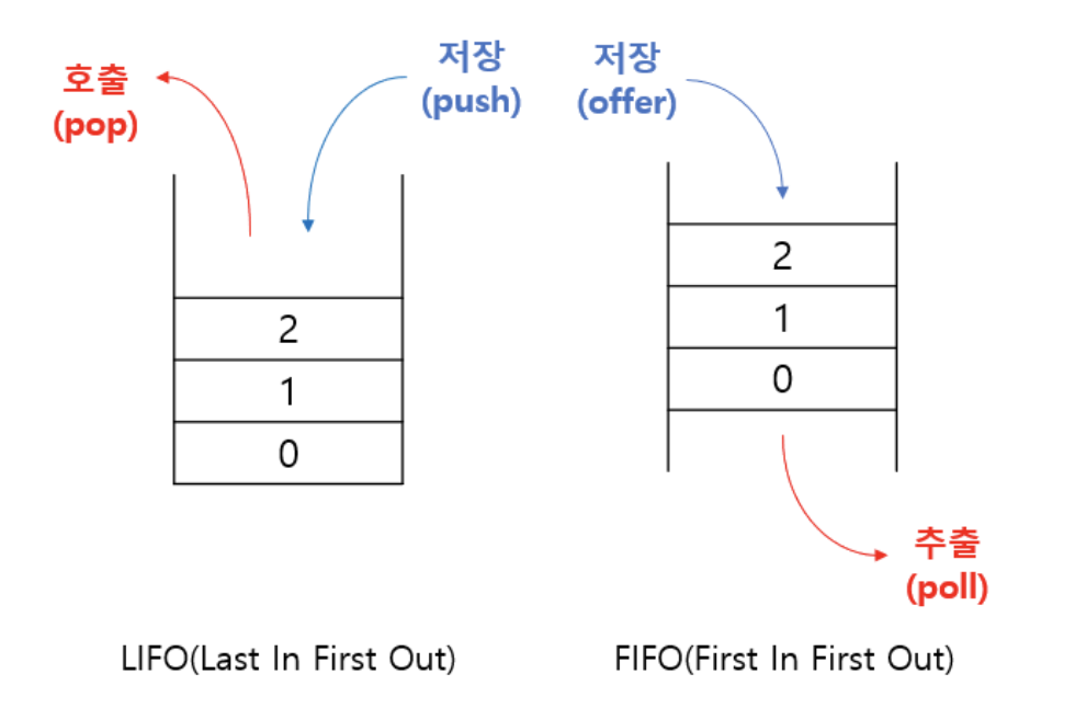 Stack : Last In First Out 구조로 마지막에 저장된 데이터를 가장 먼저 꺼내는 구조이다. 순차적으로 데이터를 추가하고 삭제하기 때문에 배열 기반인 ArrayList 같은 컬렉션 클래스가 적합하다.