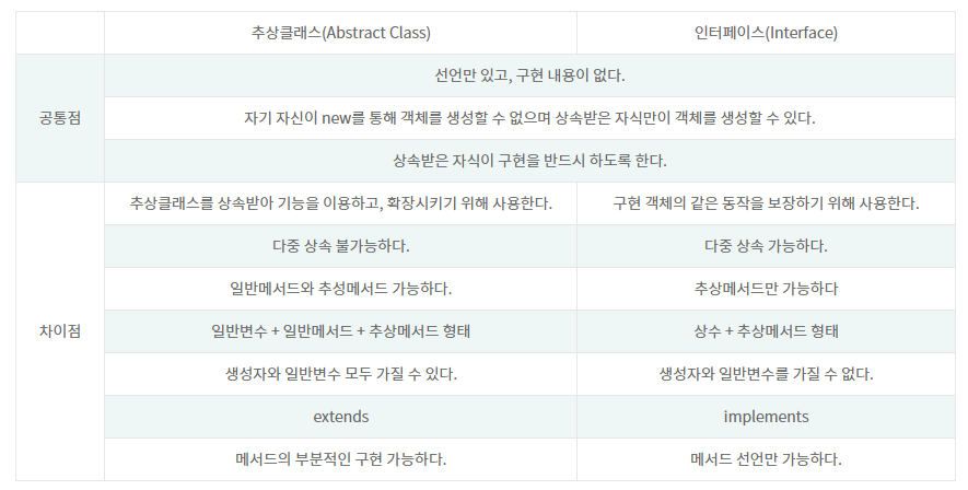 추상클래스 : 추상 클래스는 추상 클래스를 상속받아서 기능을 이용하고 확장시키는 목적을 가지고 있다. 반드시 하나 이상의 추상메서드를 가지며 상속을 위한 클래스이기 때문에 객체를 생성할 수 없고, 다중 상속이 불가하다.