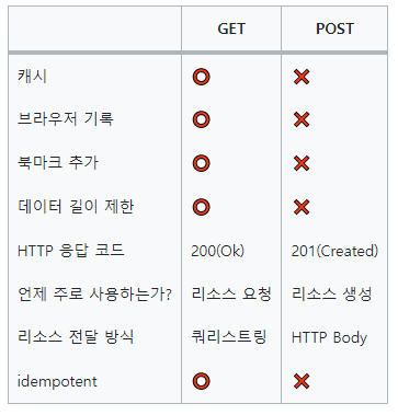 - GET : 주로 데이터를 읽거나 검색할 때 사용되는 메소드이다. 오로지 데이터를 읽을 때만 사용되고 수정할 때는 사용하지 않는다. 같은 요청을 여러번 보내도 항상 같은 응답을 받는다.(Idempotence 하다.)