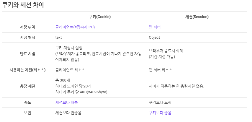 Cookie : 정보를 유지할 수 없는 성격을 가진 HTTP의 단점을 해결하기 위해 쿠키라는 개념이 도입되었다. 쿠키는 클라이언트 로컬에 저장되는 키와 값이 들어있는 작은 데이터 파일이다. 클라이언트의 상태 정보를 로컬에 저장했다가 요청할 때 참조된다. 이로인해 탈취, 변조될 위험이 있어 보안이 취약하다. 서버측에서 만료날짜/시간을 지정하여 정해진 시간 동안 데이터를 유지할 수 있고, 프로세스가 종료되더라도 특정 시간까지 유효하므로 지속된다.
