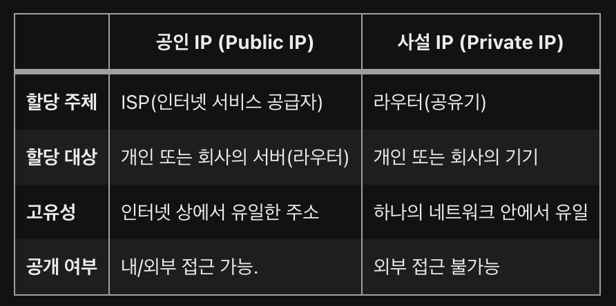 사설 IP : 일반 가정이나 회사내 등에 할당된 네트워크의 IP 주소로 로컬 IP, 가상 IP라고도 한다.