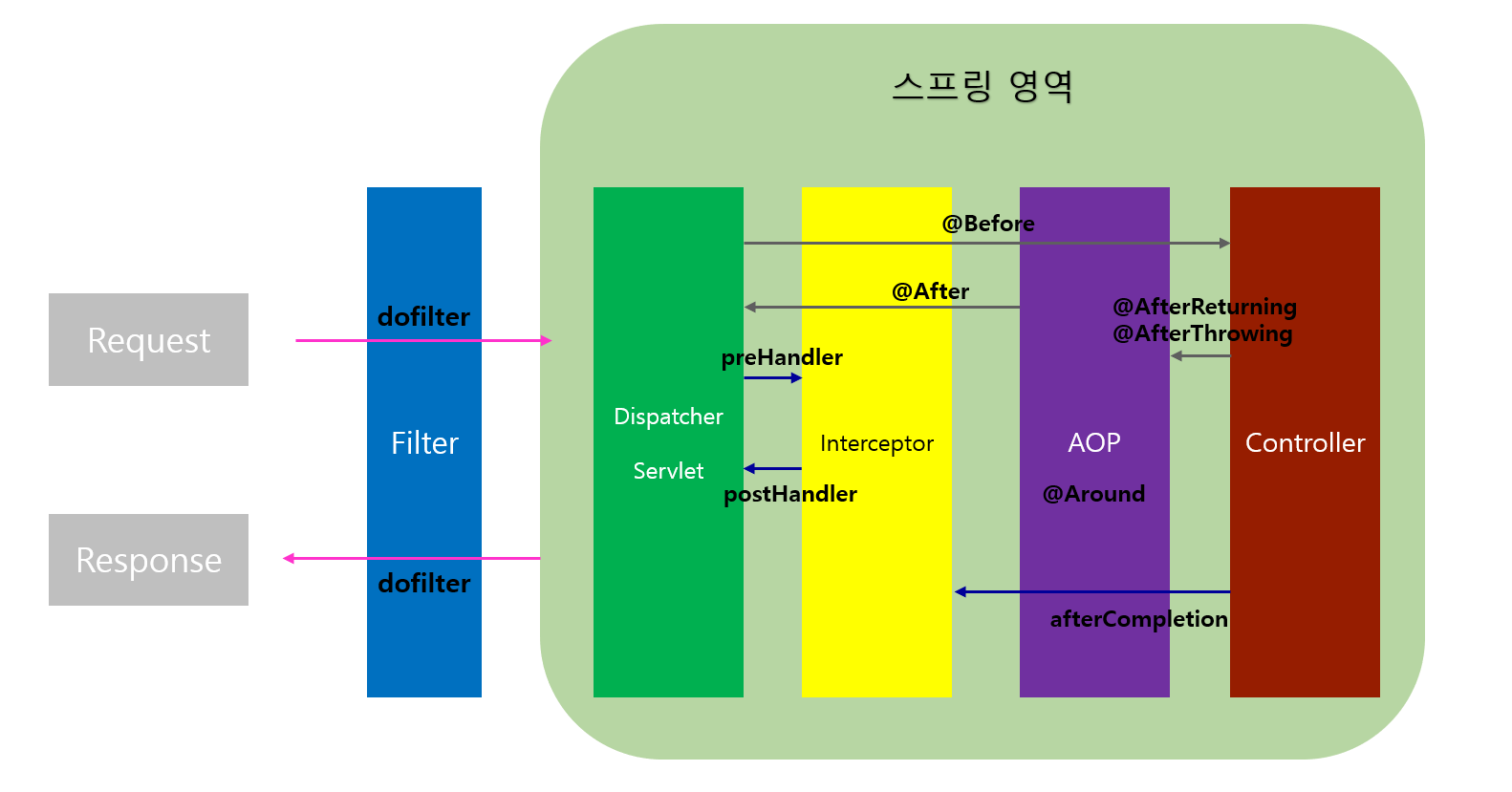 개발시 공통 업무에 관한 코드들을 따로 빼서 관리하는 방법으로 filter, interceptor, AOP가 있다. 이 세 방법은 요청 흐름에 따라 차이가 발생한다.